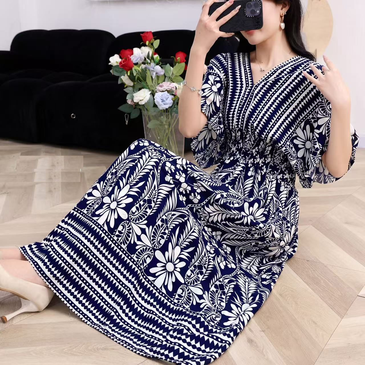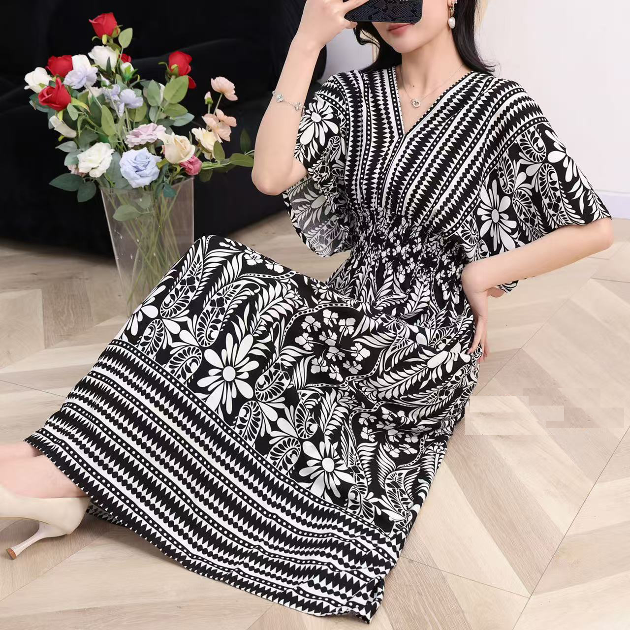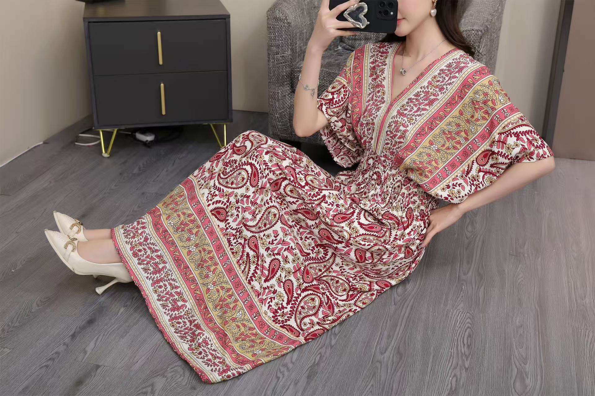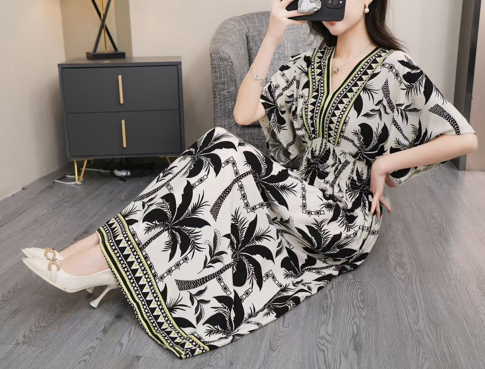 ボタニカルと幾何学柄が美しく融合。シャーリングで着心地も抜群のロングワンピ。体型カバーしながら、女性らしさもアップ。