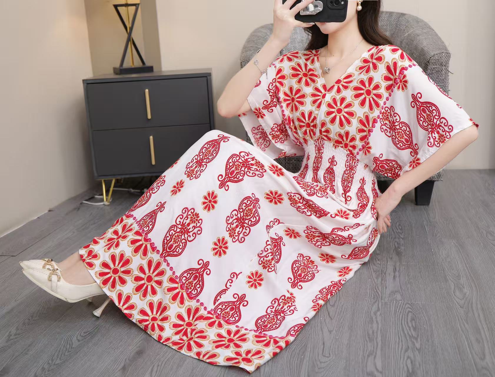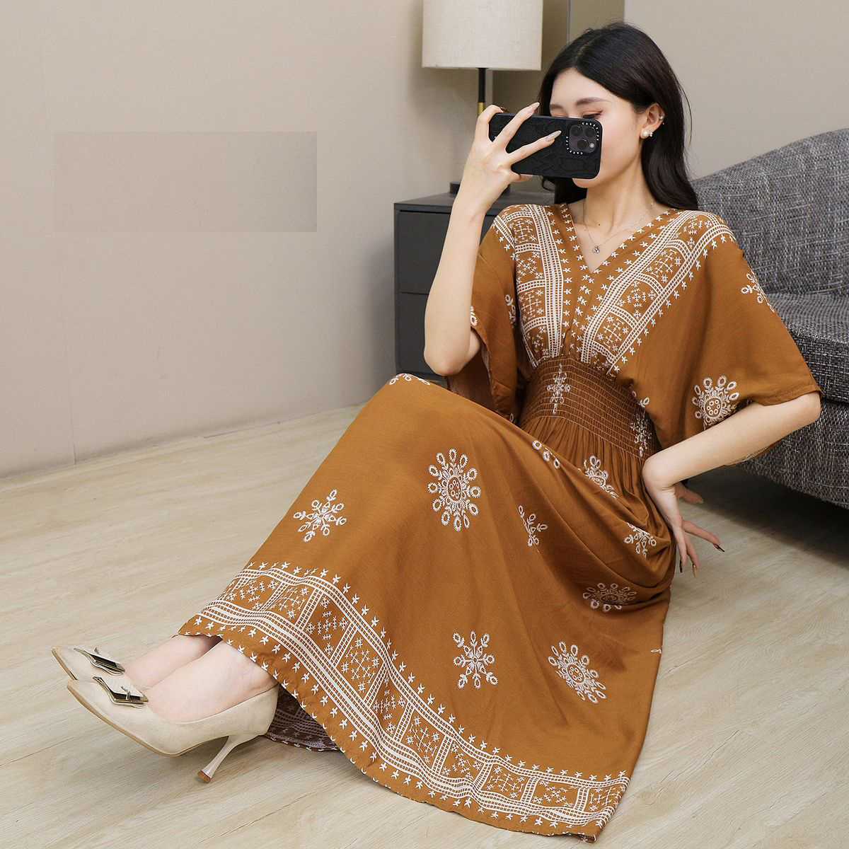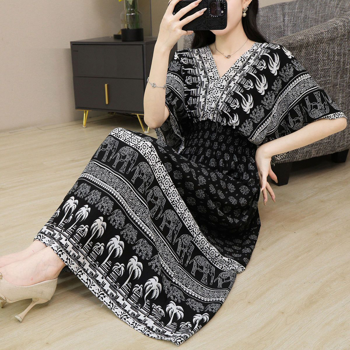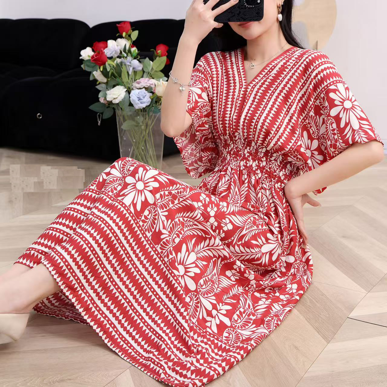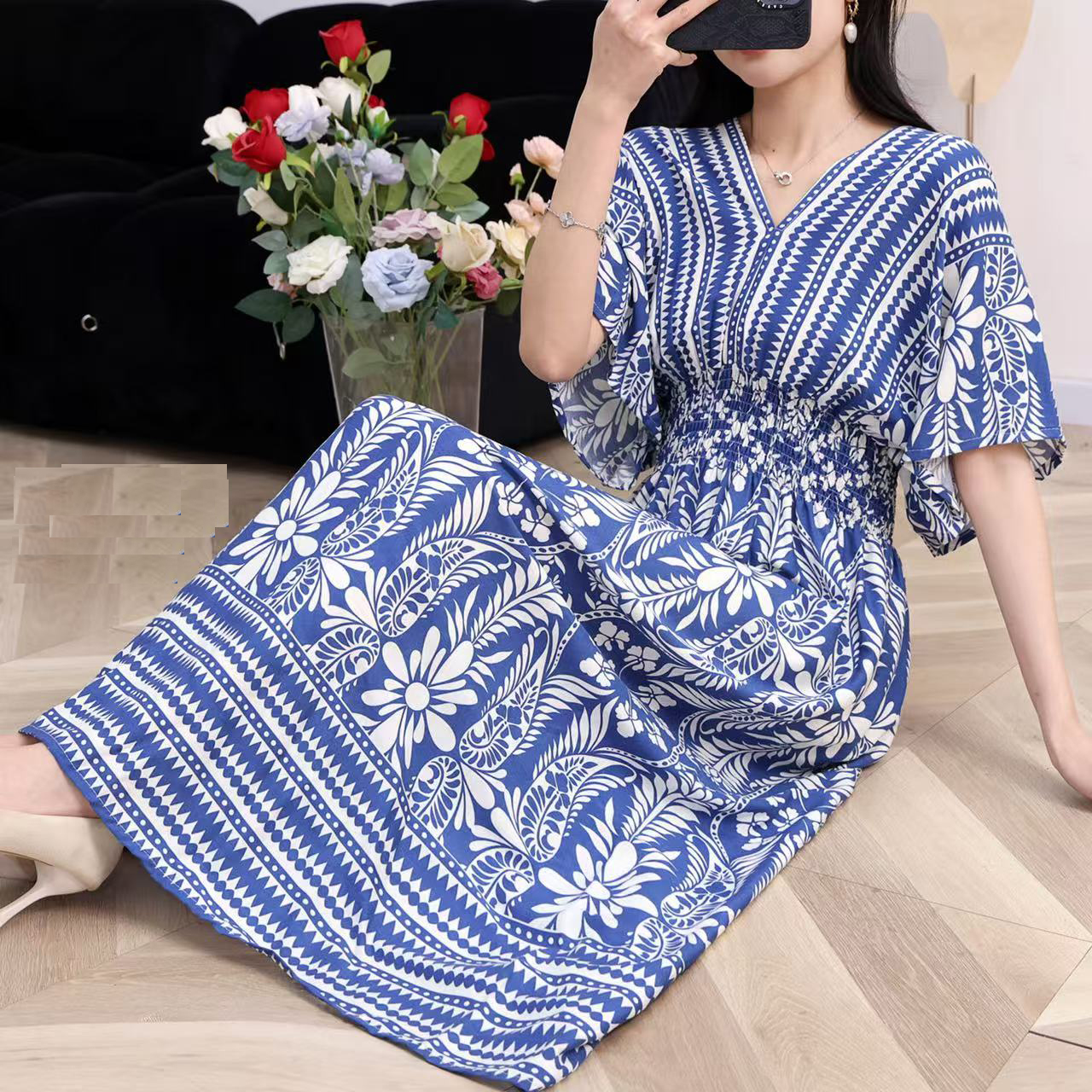ボタニカルと幾何学柄が美しく融合。シャーリングで着心地も抜群のロングワンピ。体型カバーしながら、女性らしさもアップ。
