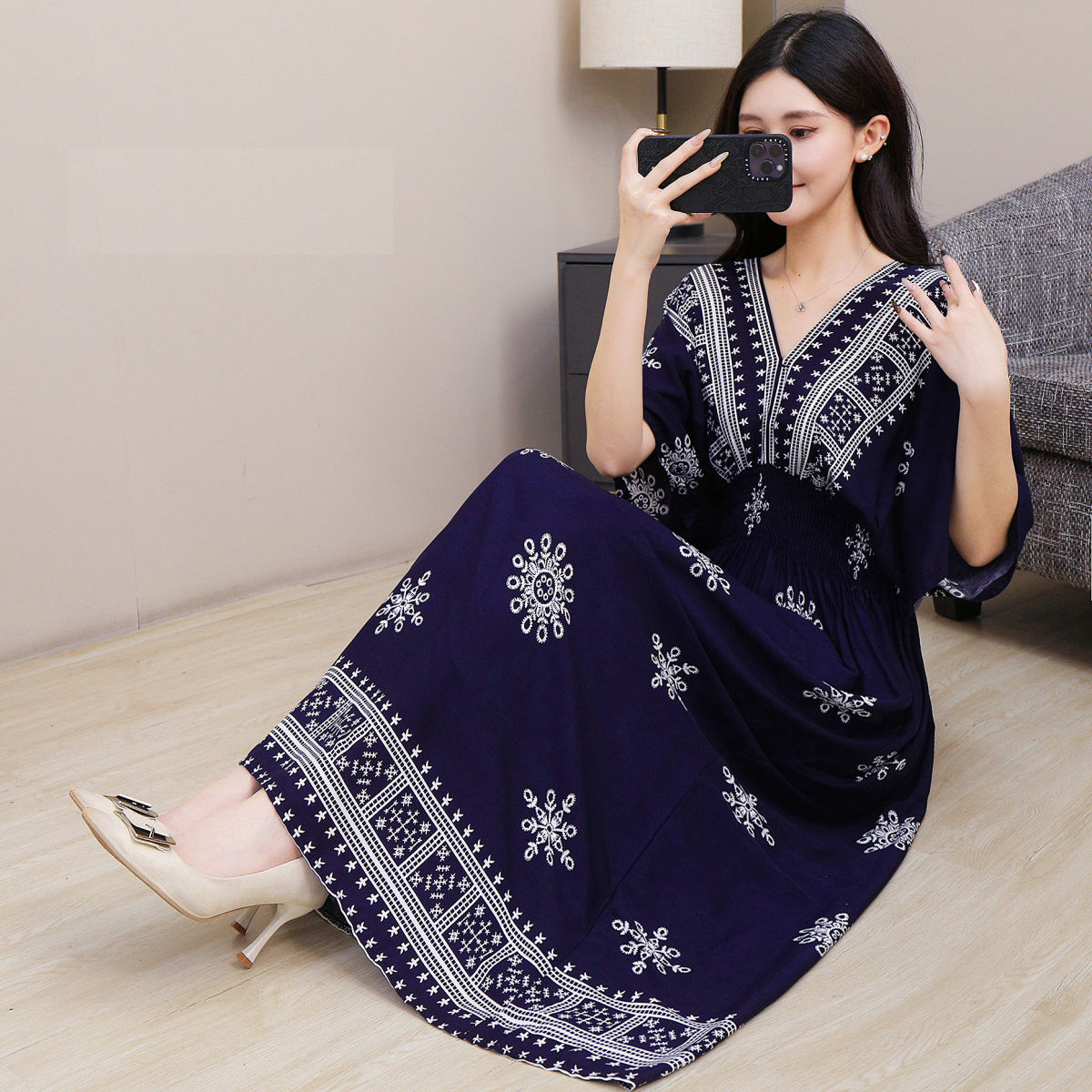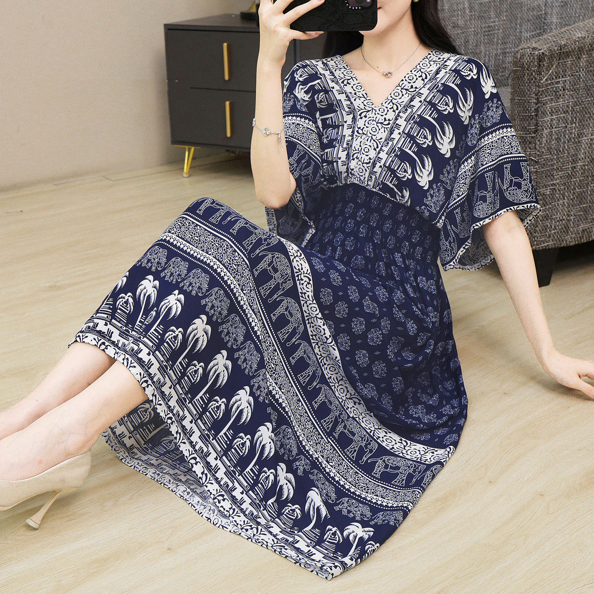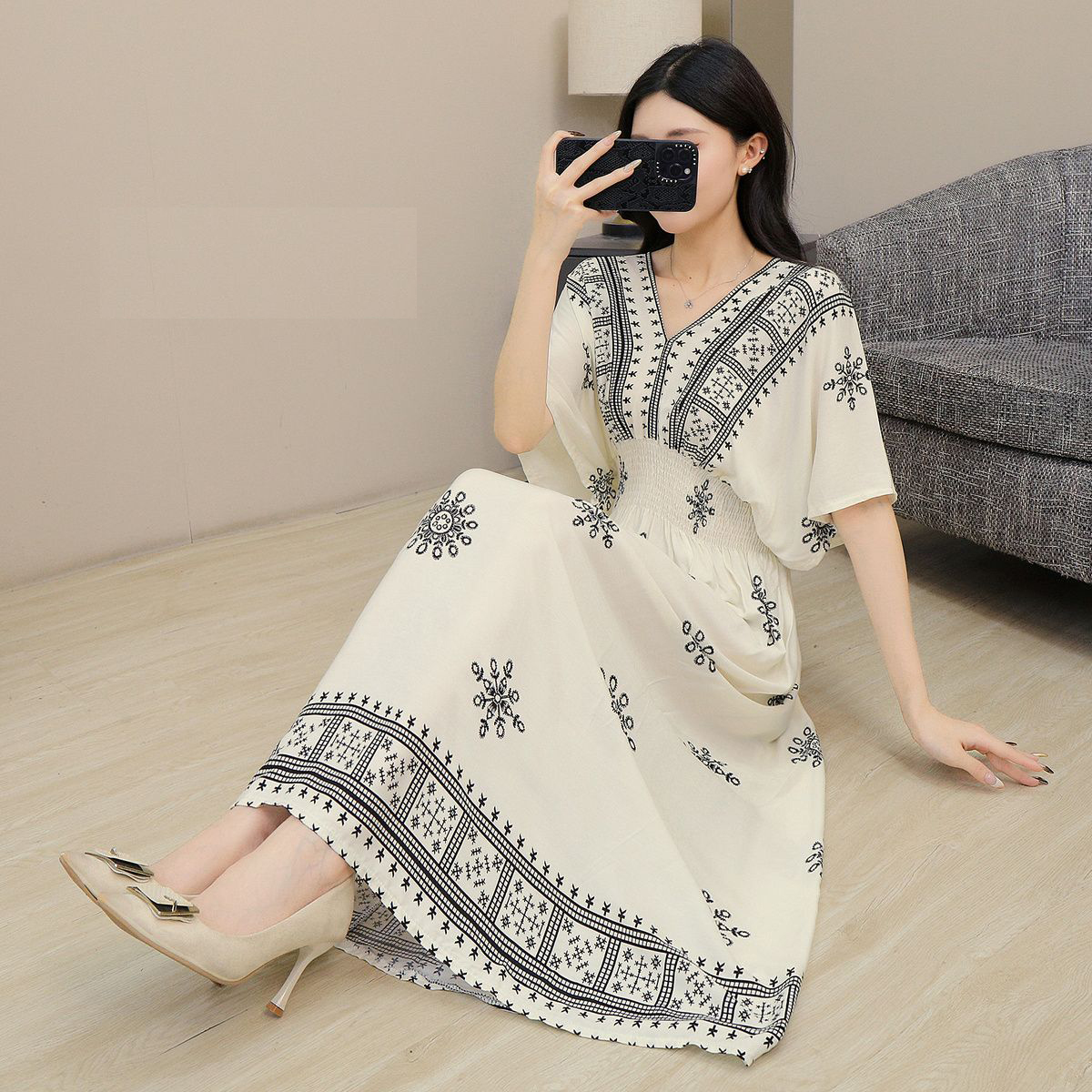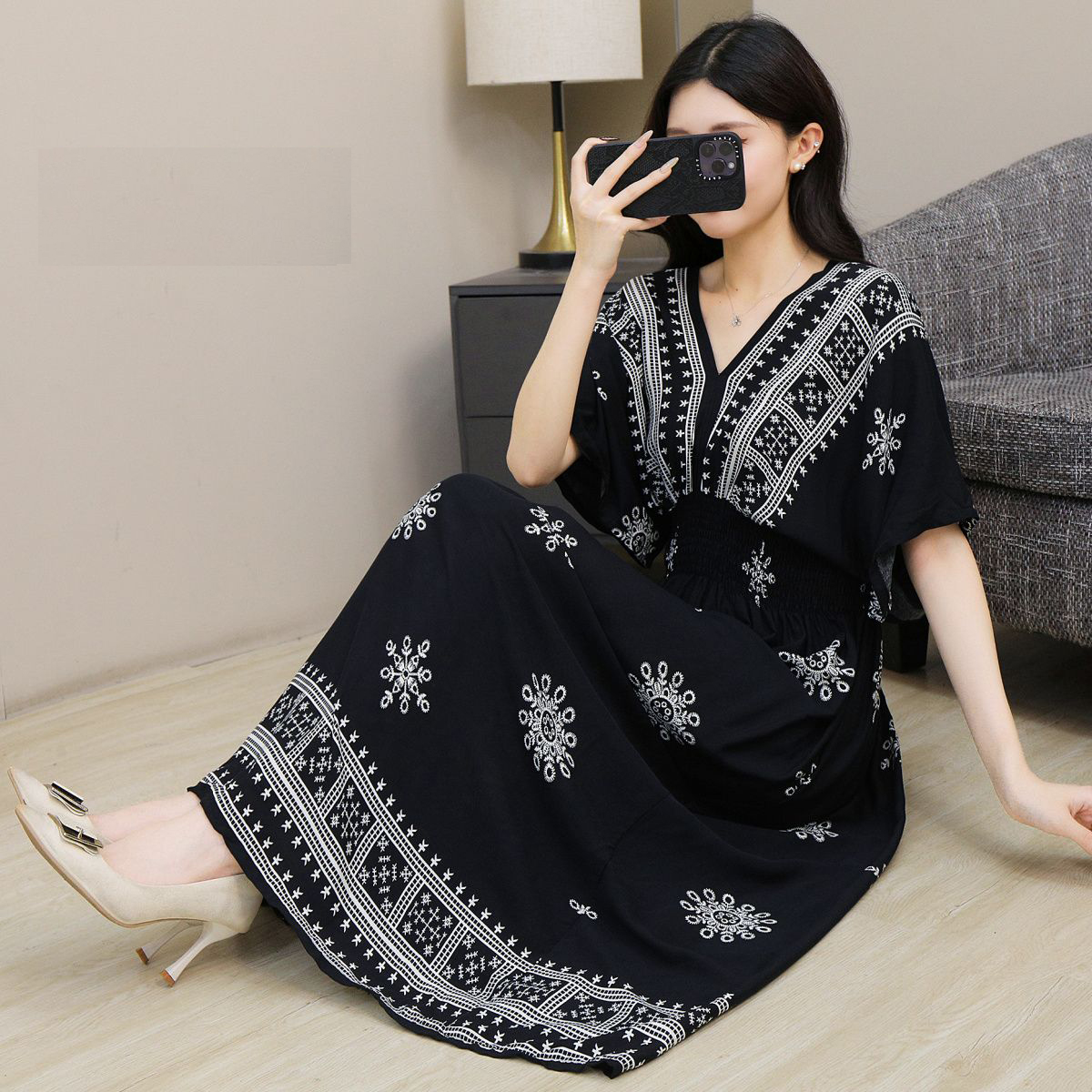ボタニカルと幾何学柄が美しく融合。シャーリングで着心地も抜群のロングワンピ。体型カバーしながら、女性らしさもアップ。